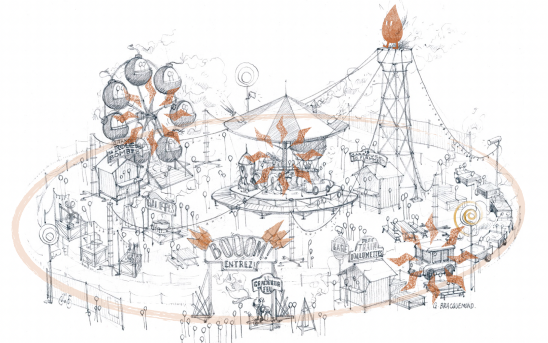 La Grande Roue de Bombes, Le Carrousel de Flammes, le Petit Train d’Allumettes constituent les attractions majeures aux yeux des enfants. Pour y accéder, il faut passer par le Guichet Boom et réussir à déclencher le Cracheur de Feu. Les odeurs de gaufres au piment enflamment les narines et se mêlent à celles des pétards ficelles. Les jeux de force et d’adresse attirent les plus téméraires. D’autres manèges de la famille ont disparu de la circulation depuis bien longtemps, il faut dire que certains d’entre eux étaient dangereux…
